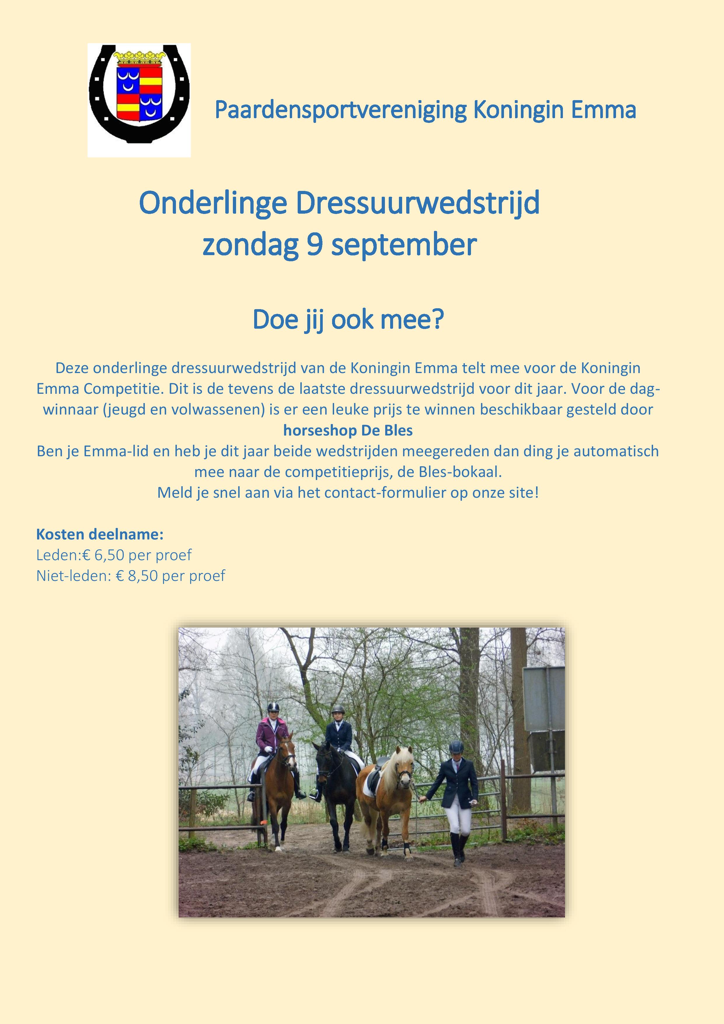 Deze wedstrijd telt mee voor de Koningin Emma Competitie. De wedstrijden zijn voor iedereen toegankelijk.  Maar alleen voor onze leden geldt dat zij naast het dagklassement ook nog opgenomen worden in het klassement van de Koningin Emma-zomercompetitie. Door aan twee van de drie wedstrijden mee te doen, ding je mee naar de competitieprijs. Voor de zomercompetitie word het gemiddelde van de twee hoogste scores van de drie wedstrijden gebruikt, rijd je 1 proef dan telt alleen die score mee om de stand te bepalen.